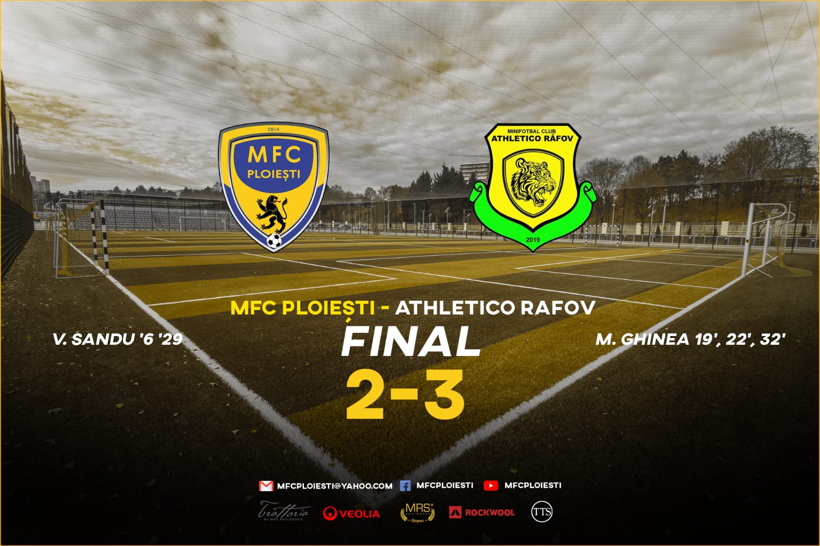 In cadrul etapei cu numărul 8 a Ligii A de Minifotbal din Prahova, MFC Ploiești a întâlnit, miercuri, 16 martie 2022, cu incepere de la ora 19.30, echipa Atheltico Rafov, partida ce s-a disputat pe cocheta Baza Sportivă Kiru Sport Ploiești, acolo unde echipa noastră a cedat, la limită, toate cele 3 puncte puse in joc.