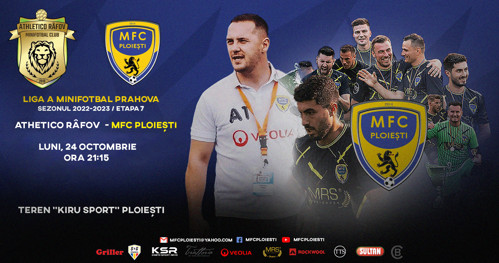 Luni, 23 octombrie 2022, pe terenul 1 al Bazei Sportive Kiru Sport Ploiești, cu incepere de la ora 21.15, MFC Ploiești întâlnește Athetico Râfov, intr-un meci care va conta pentru etapa cu numarul 7 a Ligii A MiniFotbal Prahova.